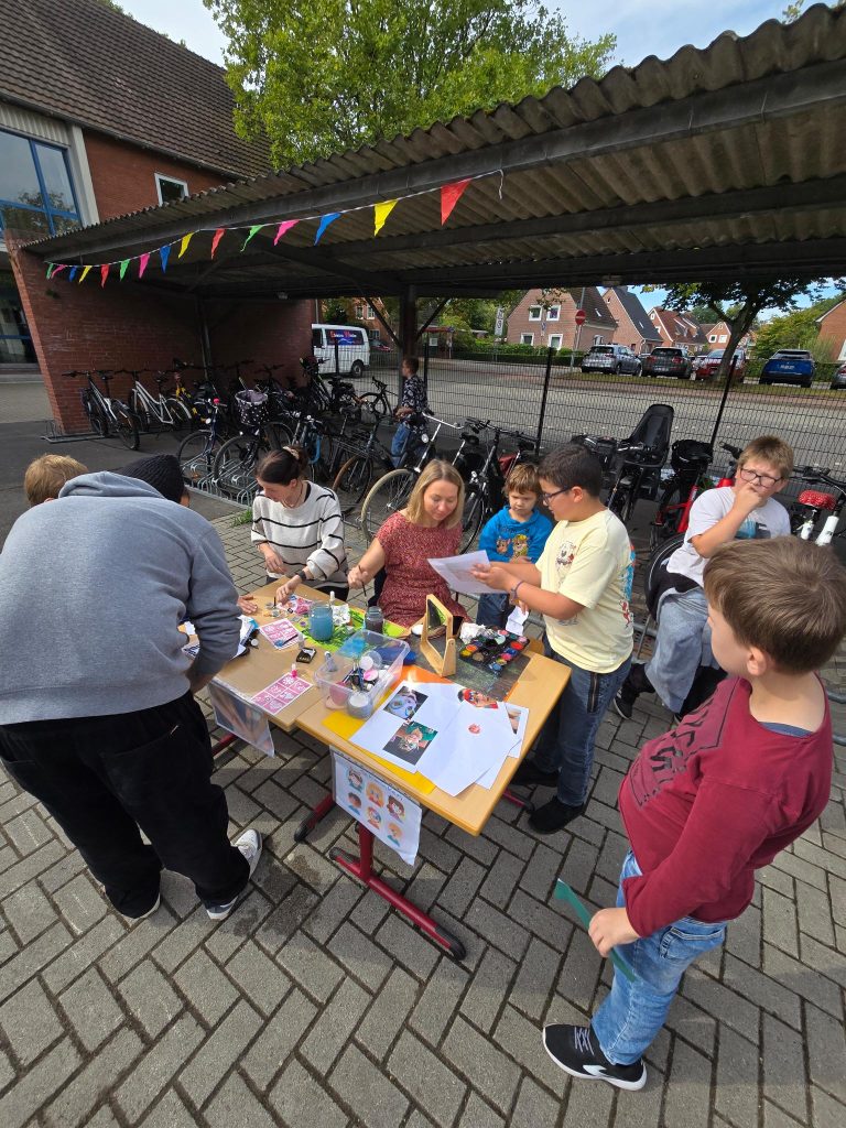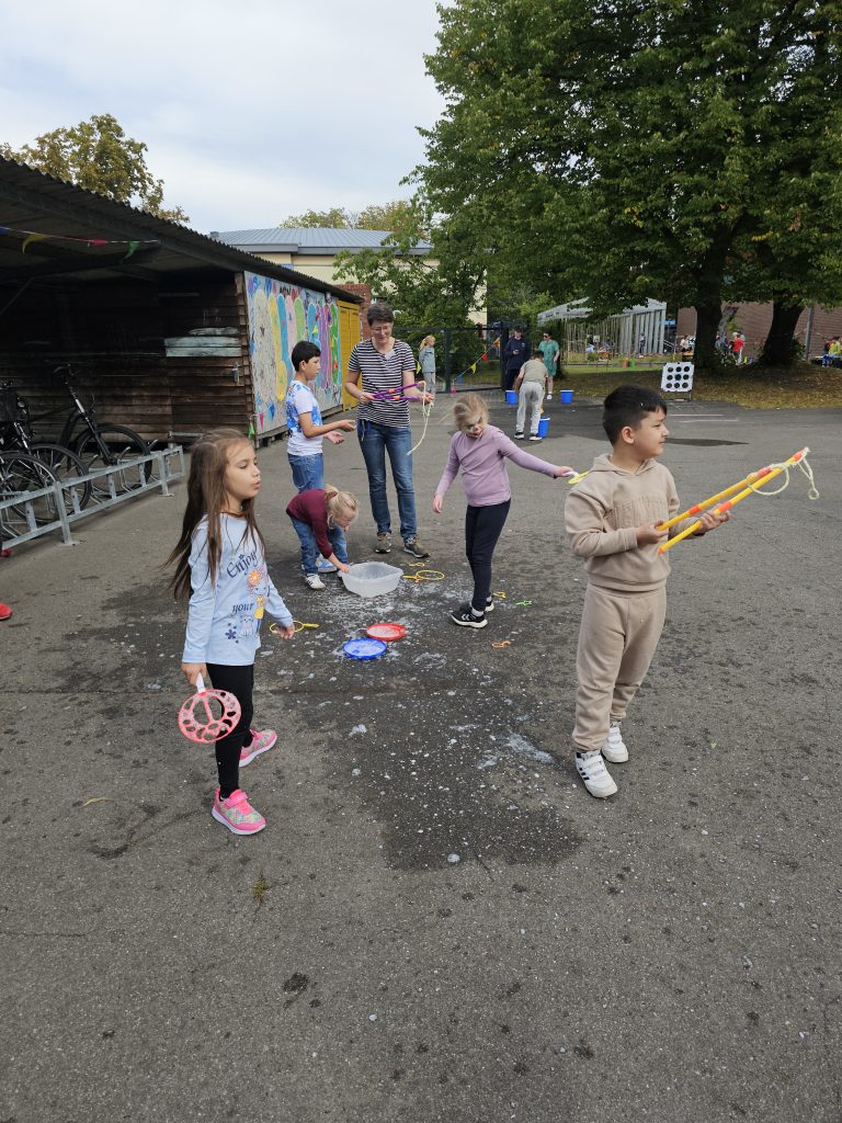 Die Teilnehmenden waren sehr kreativ und haben tolle Spiele und Stände aufgebaut. Riesenseifenblasen, Entenangeln, Wurfspiele, Maltisch, Straßenkreide, Schminken,